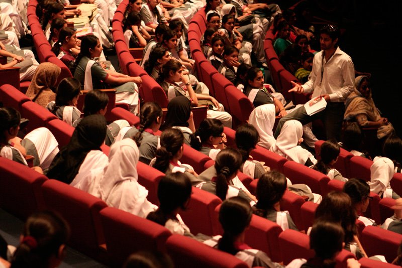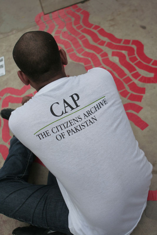 Artist Shalalae Jamil interacts with young participants. Her exhibit featured a close-up of Allama Iqbal, South Asian poet-philosopher credited for imagining the concept and identity of Pakistan through his writings. Jamil's interactive work invited viewers to take with them a print of Iqbal's portrait from a stack of posters piled in front of the hung work.